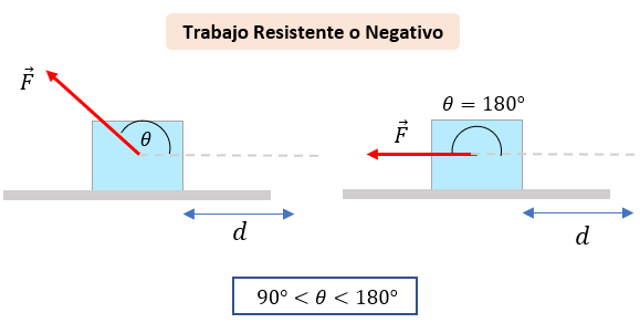 Cuando la fuerza forma un ángulo obtuso con el desplazamiento, se considera a la fuerza como resistiva por que es capaz de disminuir la rapidéz de la partícula. Por tanto el trabajo es negativo o resistivo.